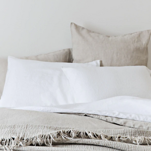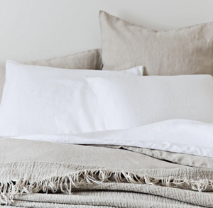 Pure French Linen in a subtle shade of Pure White. It looks stunning against any of the colours in the collection and pairs beautifully with the reversible natural and white stripe bed quilt.