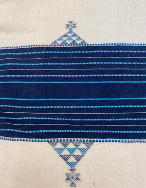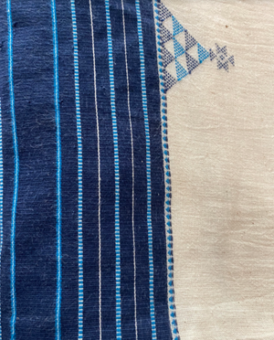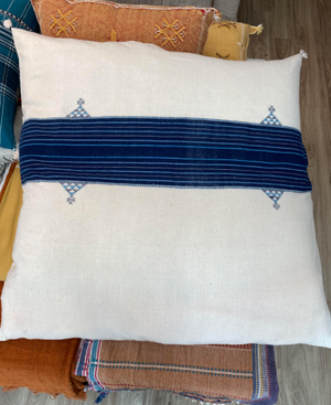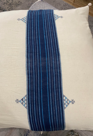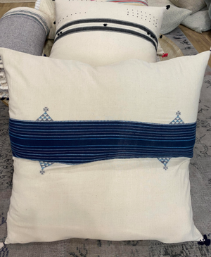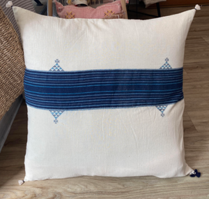 Hand Loomed pure cotton cushion with exquisite stitch detail and measuring a generous 80x80cm. Beautiful stripes of dark and light blue on a cream background.