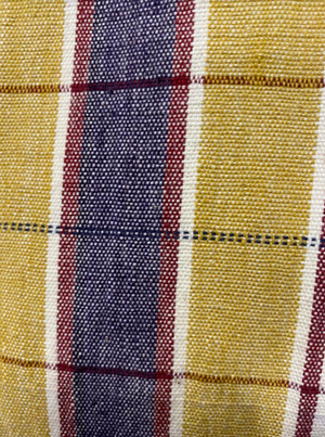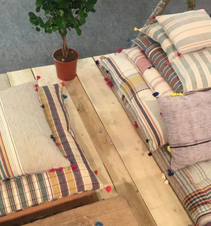 Lovingly made by traditional artisans, this pure cotton and linen cushion is exquisite with hand loomed stitching and measuring a generous 80x80cm. Beautiful textured stripes of denim blue, mustard, green and deep red on an off white background with cotton tassels.  Insert not included.