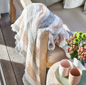 Add some summer cheer into your home this season with our new Carnivale throw. Made from a drapey, soft linen-cotton blend, it features our hero colours for this summer, including crisp white, khaki and rose dust. The throw has a beautiful elegant fringe that is minimalist simplicity. Elegant, fun and fresh!