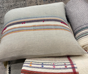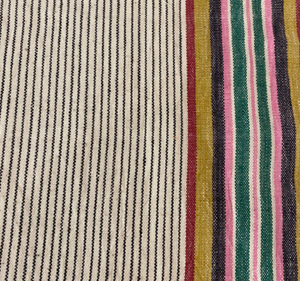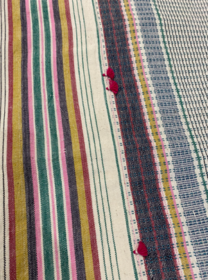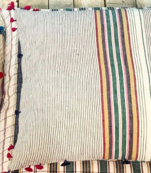 Hand Loomed pure cotton large floor cushion with exquisite stitch detail and measuring a generous 80x80cm. Stunning multiple stripes of blue, black, green, grey, pink, red and mustard on a cream background. Metal button closure at the back and adorned with miniature tassels.